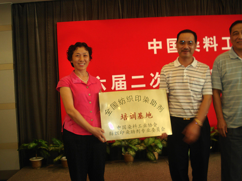 阮加春總經(jīng)理代表中國染料協(xié)會理事會頒發(fā)“全國紡織染料助劑培訓基地”牌匾。